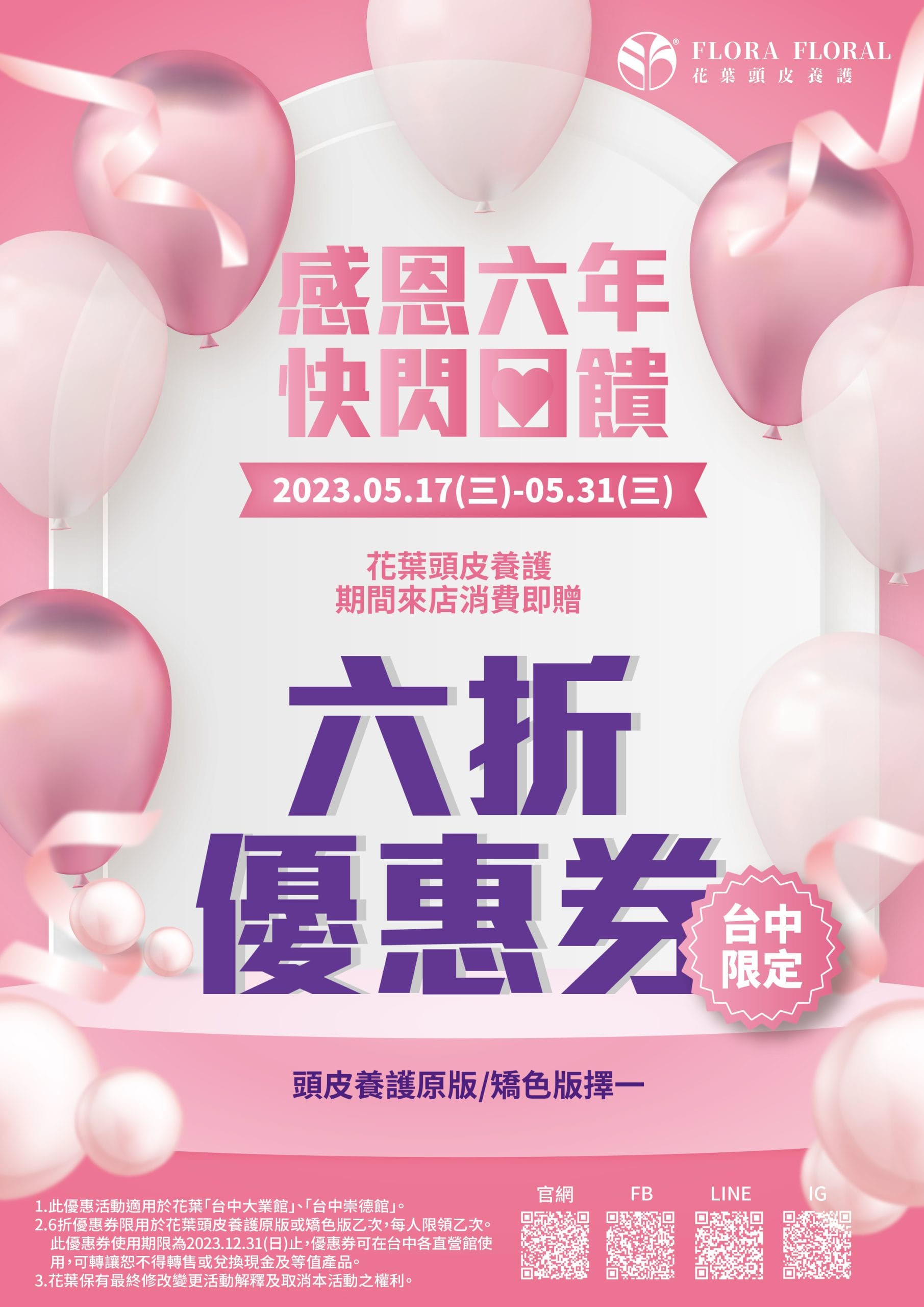 【感恩六年快閃回饋】六折優惠券花 編2023/05/17優惠活動首頁 優惠活動 【感恩六年快閃回饋】六折優惠券台中限定快閃活動#花葉頭皮養護感恩有您的支持與鼓勵2023.05.17(三)起至05.31(三)止只要您來店消費我們將贈送您「六折優惠券」乙張可消費花葉頭皮養護原版或矯色版乙次喔這麼好康還不快點揪親朋好友一起來體驗看看立即預約【預約台中大業館】04 2251 9121台中市南屯區大業路395號https://lin.ee/wi65ZGC【預約台中崇德館】04 2241 2058台中市北屯區文昌三街2號https://lin.ee/r35jLD4#花葉頭皮養護專家#中草藥頭皮養護#頭皮養護#頭皮護理#遮蓋白髮#深層潔淨#頭皮保養 分享你的喜愛