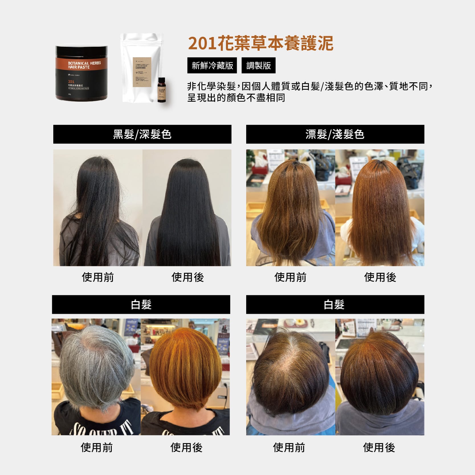 ★201養護泥內含草本成分會使白髮/淺色髮有上色效果,顏色多為暖色系(黃紅橘)並會依照養護次數不同,顏色會越來越飽和,介意者請勿購入